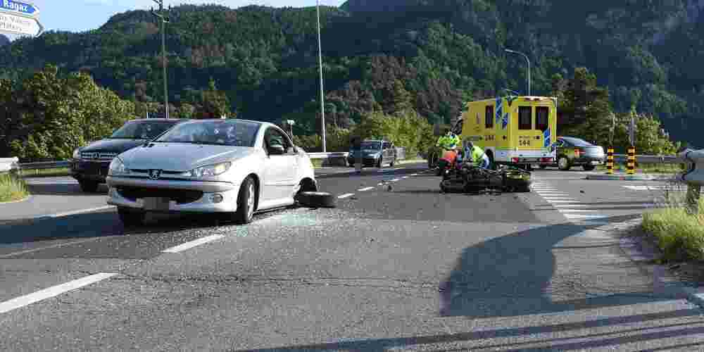 Ein 55-jähriger Autofahrer verliess am Sonntag die Autobahn bei der Ausfahrt Bad Ragaz. Er beabsichtigte links in Richtung Fläsch abzubiegen. Gleichzeitig fuhr ein 35-jähriger Motorradfahrer auf der Rheinaustrasse in Richtung Bad Ragaz. Dabei kam es zur seitlich-frontalen Kollision der beiden Fahrzeuge.
