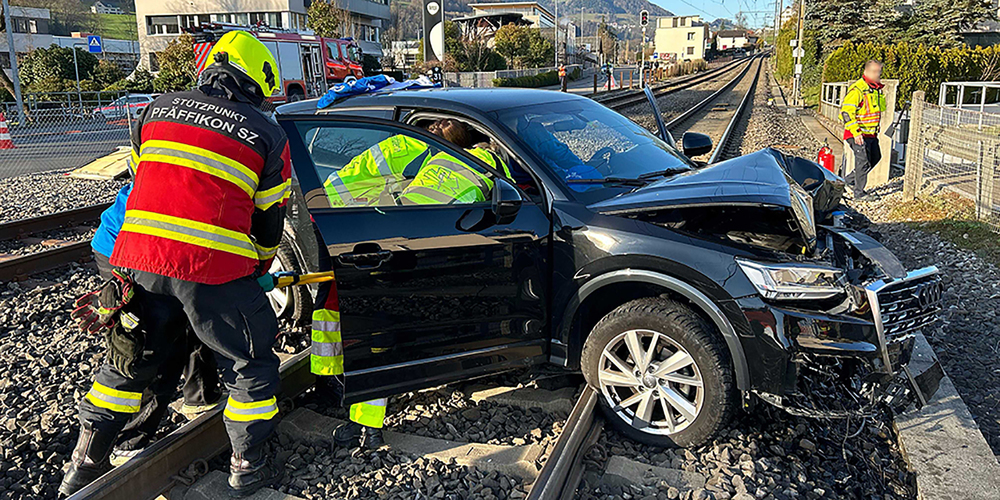 Beim SOB-Bahnhof in Freienbach gerät am 18. März ein Auto auf das Bahngleis. Schlimmeres kann verhindert werden, aber der Fahrer wird verletzt.