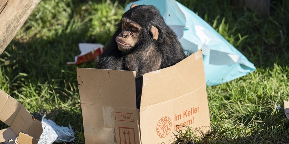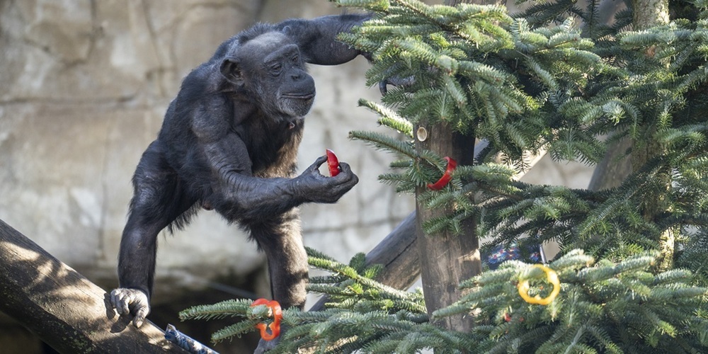 Tierische Weihnachten freut die Besucher:innen und bietet den Tieren eine sinnvolle Beschäftigung. Mit Geschicklichkeit und manchmal auch mit Gewalt werden die Leckereien aus den schönen Geschenken ausgepackt oder vom Tannenbaum entfernt.