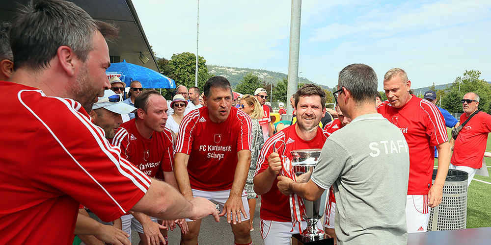 Grund zur Freude hat auch der FC Kantonsrat Schwyz. Die sportlichen Politiker holen erstmals den Schweizer-Meister-Titel an der Eidgenössischen Parlamentarier-Fussballmeisterschaft in Delsberg.