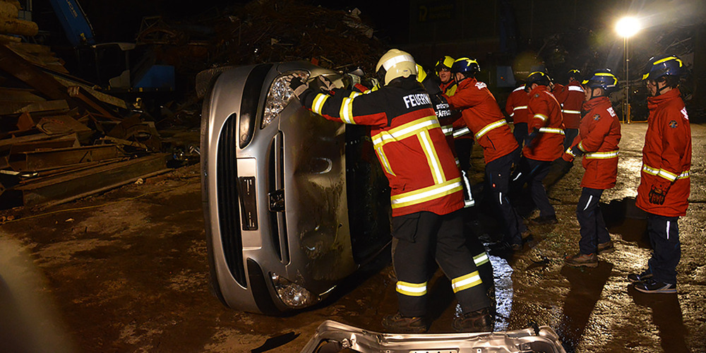 Da die Feuerwehr nicht nur zur Brandbekämpfung in den Einsatz gelangt, organisierte der Team-Leiter für die letzte Übung des laufenden Jahres etwas Besonderes. Es galt, eingeklemmte Personen aus einem Fahrzeug zu retten. Erschwert war die Situation, weil das Auto sich überschlagen hatte und auf dem Dach gelandet war. Auf dem Areal der Inderbitzin Metall-Recycling AG an der Talstrasse in Altendorf galt es, nach Eintreffen auf dem Schadenplatz möglichst rasch die eingeklemmten Insassen aus dem Fahrzeug zu retten. Während eine Gruppe das Fahrzeug mittels Habeggerseilzug sicherte, stellte die andere Gruppe das für die Rettung erforderliche Material bereit.