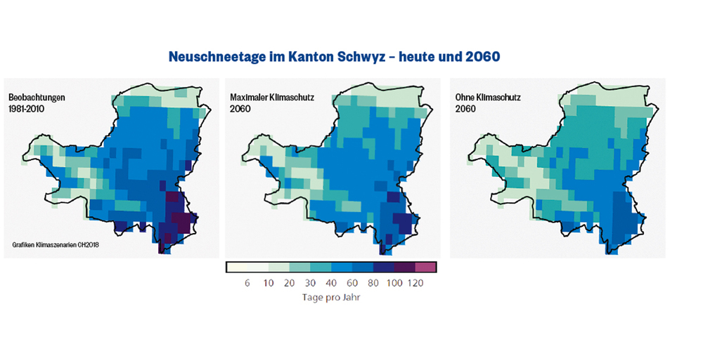 Was die Wintersportgebiete im Kanton Schwyz – die ja nicht sehr hoch liegen – weniger freuen wird, sind die Klimaszenarien für den Winter. So geht die Studie von massiv weniger Schneetagen (Tage mit einer Schneehöhe von mehr als einem Zentimeter) aus. Dies würde sich weniger in den Niederungen in Ausserschwyz als in den erhöhten Lagen im Kanton Schwyz zeigen.