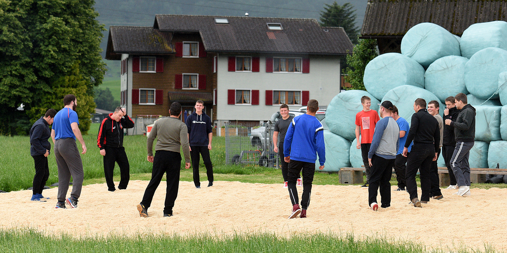 Es ist 18.30 Uhr, 15 Jungschwinger rennen zum Einlaufen die Strasse runter und wieder rauf. Doch deswegen sind sie nicht gekommen, das sieht man auch sofort. Endlich dürfen sie wieder ins Sägemehl. «Diesen Geruch habe ich vermisst», sagt Pressechef Hansruedi Ulrich. Nicht alle Jungs nehmen das Training gleich ernst.