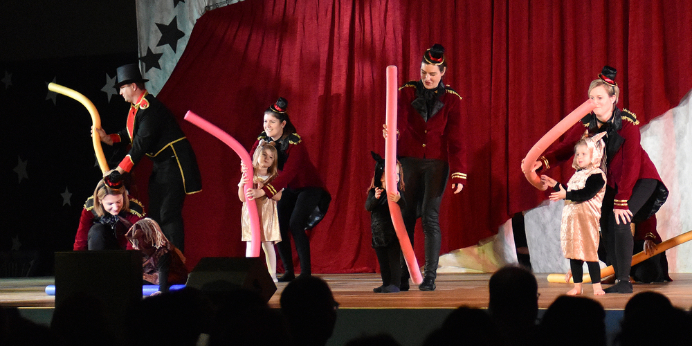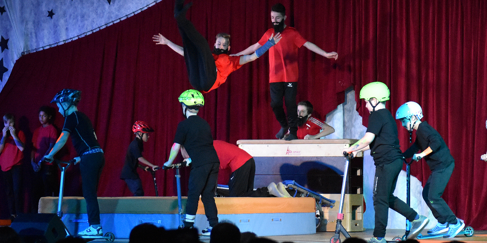 Bereits im Foyer stach einem der Popcorngeruch in die Nase und stimmte die Zuschauer auf das kommende Programm ein. Zirkusdirektorin Sandra Heer stellte beim Einmarsch die verschiedenen Gruppen vor, und schon begann das Kinderturnen mit dem Zeltaufbau. Das Muki-Turnen begeisterte mit seinen Kindern und den schönen Kostümen zum Thema Pferdedressur. Am Spezialreck und im Bodenturnen zeigten die Clowns der Mädchenriege ihr Können. Hokuspokus zelebrierte die Ringer-riege Jugend, bevor die Jugend mixed mit ihren Kickboards akrobatische Spielereien zeigte und zur Pause überleitete.
