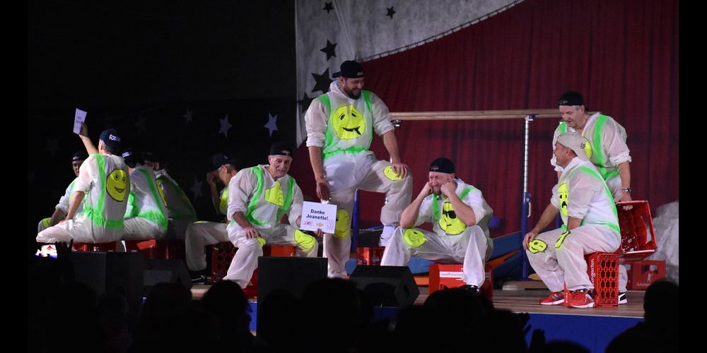 Salto Natale an verschiedenen Gräten war das Motto der Jugend Sektion, bevor sich das Team-Aerobic im Marionetten-Theater von seiner tempogeladenen Seite zeigte. Muscleman hiess die Nummer der Ringerriege Aktive, und die Geräteriege Aktive zeigte eine tolle Show an den verschiedenen Geräten. Die Männerriege bewältigte die Barrenübungen mit Bravour und benützte anschliessend Bierharassen für schweisstreibende Turnübungen. Den Abschluss der Zirkusshow bestritten die Aktiven und machten gleichzeitig den Übergang für einen gemütlichen Abend mit der Band The Rolling Barrels, mit Rätsel und Barbetrieb bis in den frühen Morgen.